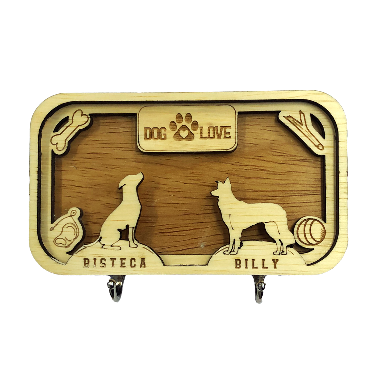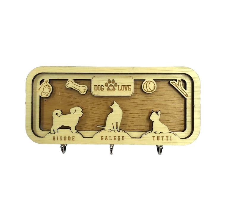 Um quadro decorativo em madeira natural com ganchos metálicos — feito para quem quer deixar tudo no lugar com estilo. Cada peça é única, produzida sob encomenda com a raça e o nome dos seus cães gravados diretamente na madeira.