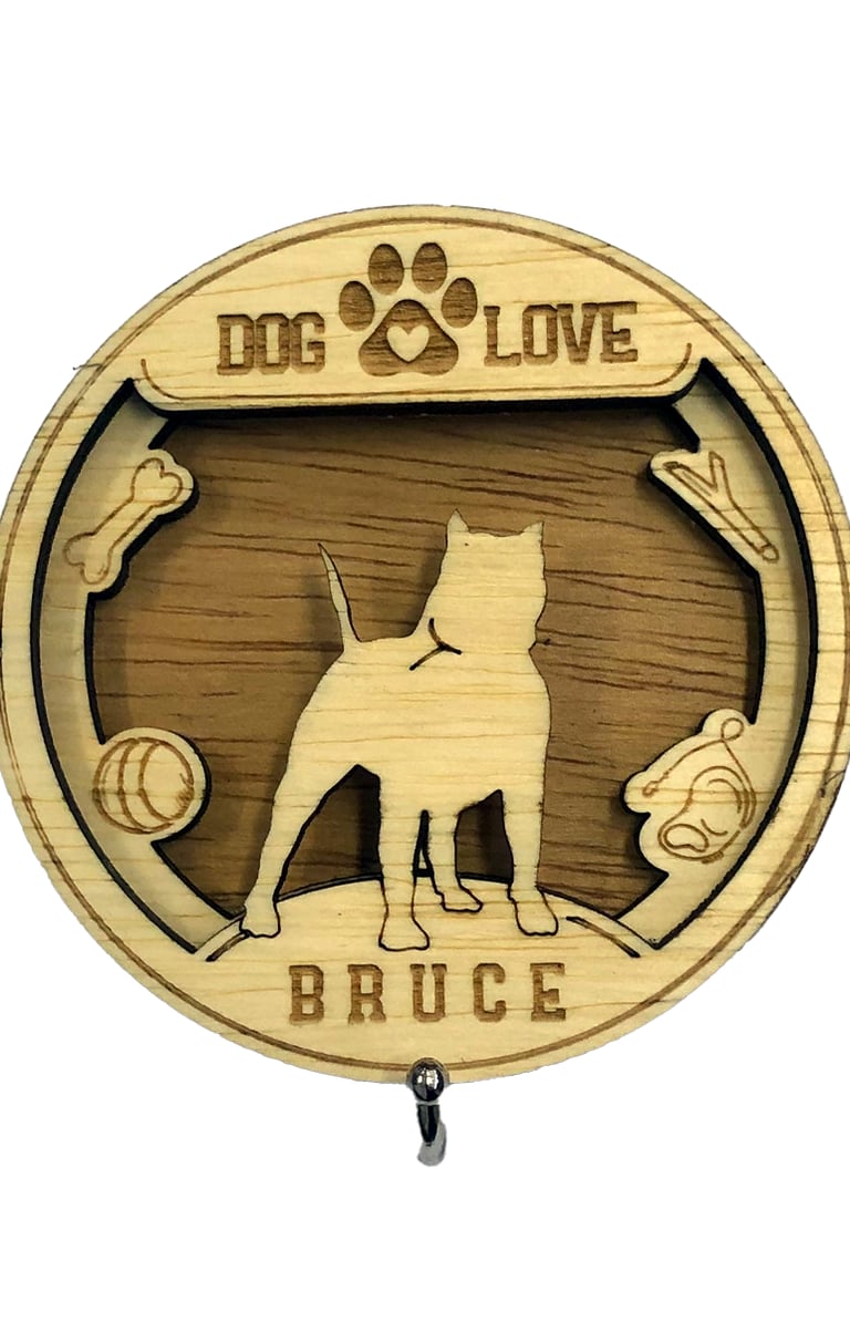 Porta-coleira em madeira natural, com a raça e o nome dos seus cães gravados a laser — feito à mão com acabamento em cera de carnaúba.