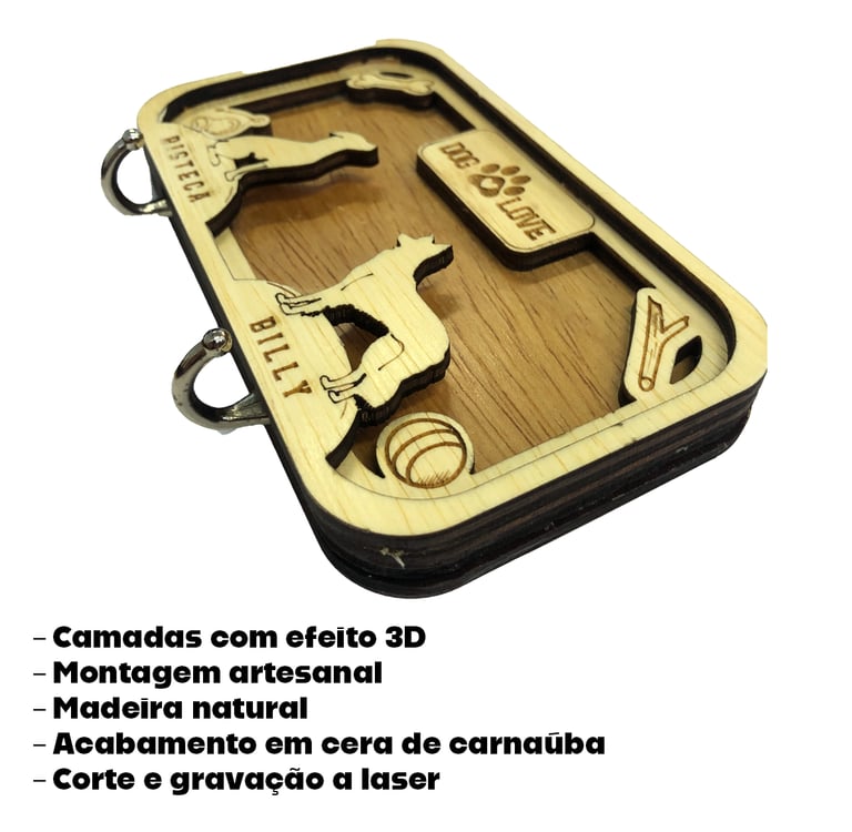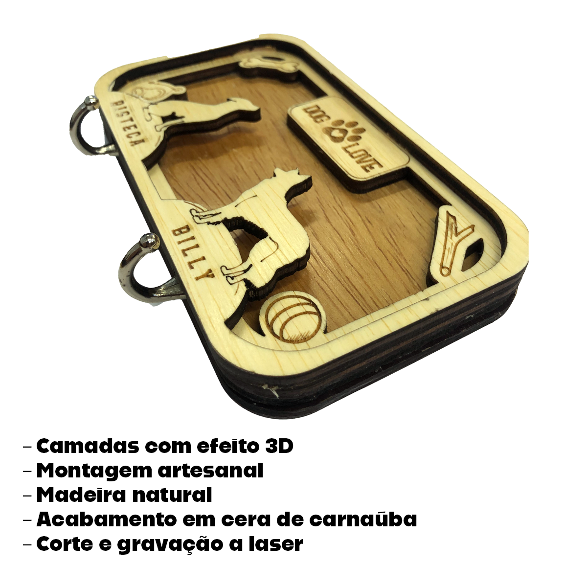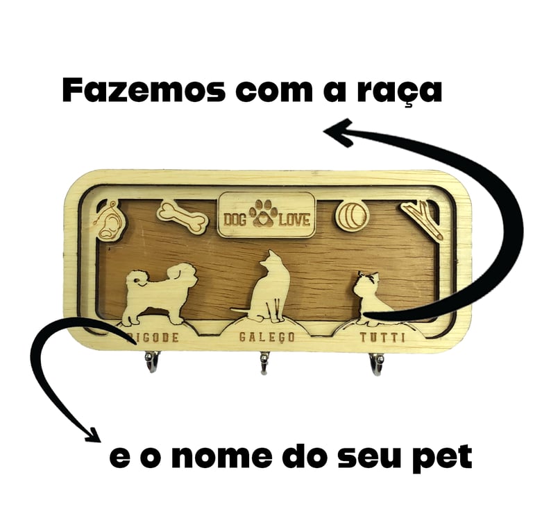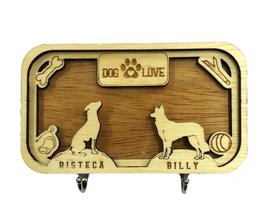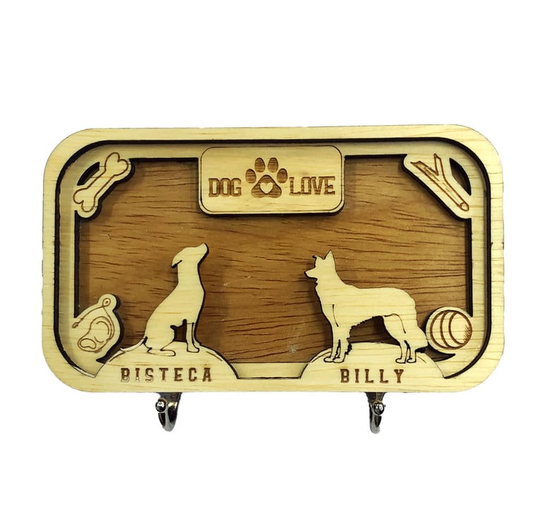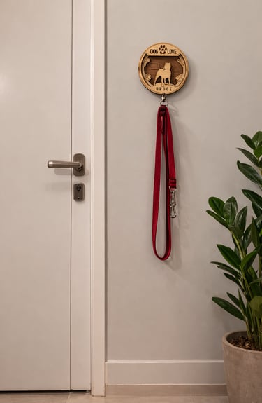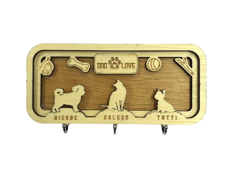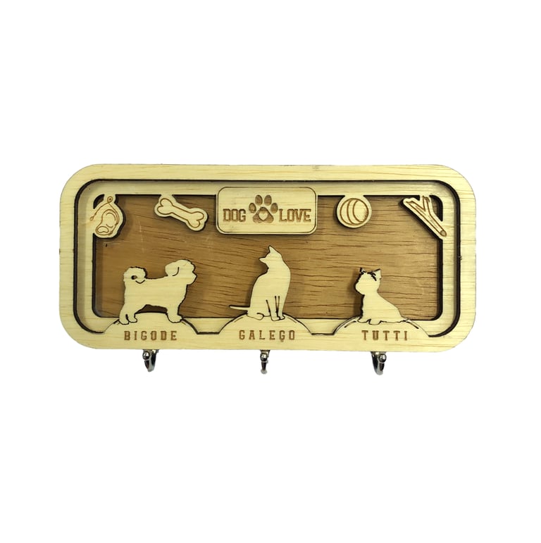Um quadro decorativo em madeira natural com ganchos metálicos — feito para quem quer deixar tudo no lugar com estilo. Cada peça é única, produzida sob encomenda com a raça e o nome dos seus cães gravados diretamente na madeira.