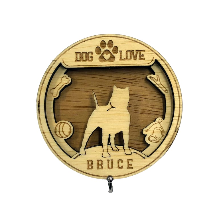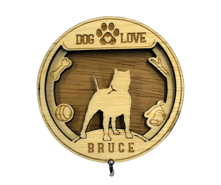 Porta-coleira em madeira natural, com a raça e o nome dos seus cães gravados a laser — feito à mão com acabamento em cera de carnaúba.